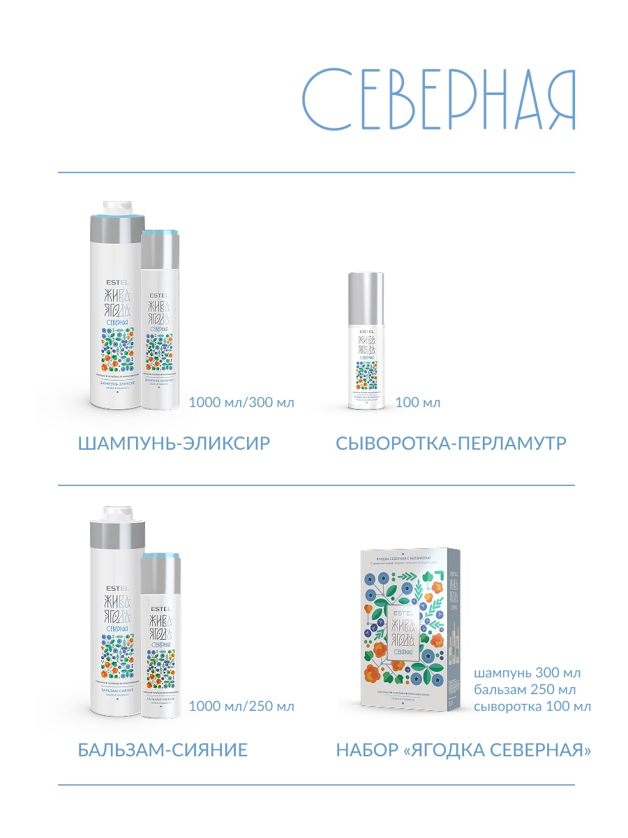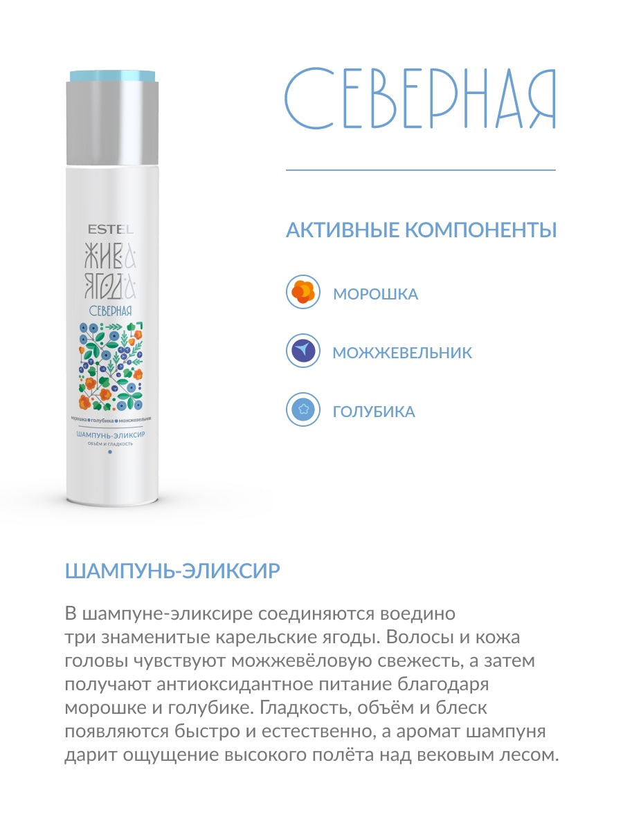 В шампуне-эликсире соединяются воедино три знаменитые карельские ягоды. Волосы и кожа головы чувствуют можжевеловую свежесть, а затем получают антиоксидантное питание благодаря морошке и голубике. Гладкость, объём и блеск появляются быстро и естественно, а аромат шампуня дарит ощущение высокого полёта над вековым лесом.
