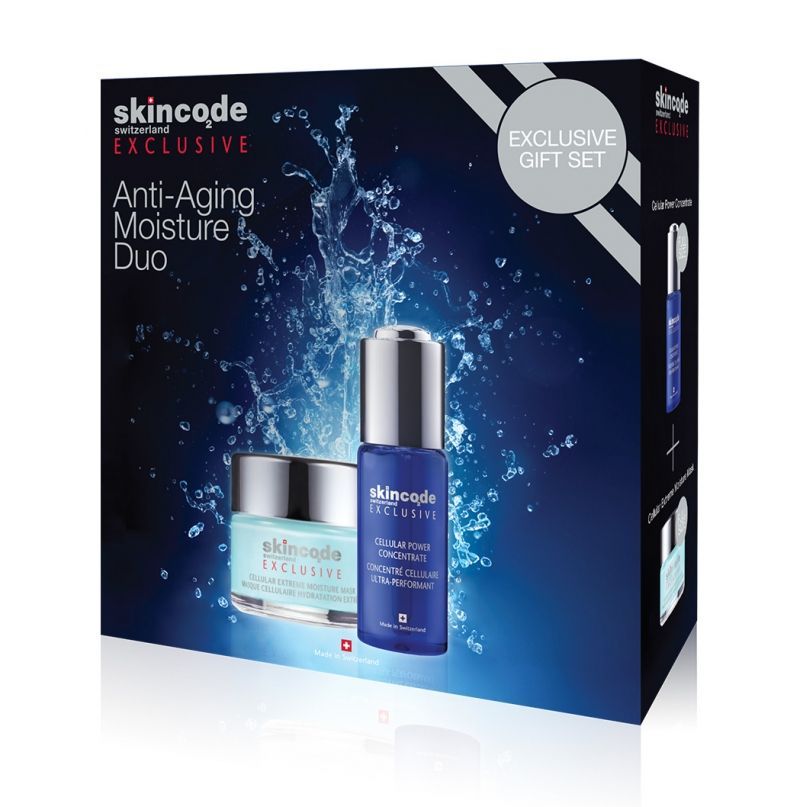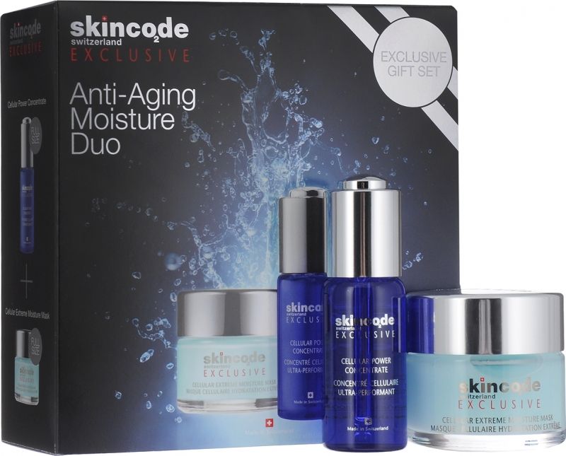 ОПИСАНИЕ Этот эксклюзивный набор для ухода за кожей является поистине мощным антиоксидантным и увлажняющим дуэтом. Он насыщает обезвоженную и уставшую кожу активными веществами в глубоких слоях, что обеспечивает моментальный комфорт и сияние кожи. Состав набора: Клеточный омолаживающий концентрат, 30 мл: Это интенсивное омолаживающее средство содержит в 5 раз больше эксклюзивного активного комплекса для регенерации клеток ACR, чем клеточные средства Skincode Exclusive для ежедневного ухода. Мощное стимулирующее средство для активизации процессов регенерации и восстановления клеток, которые с возрастом замедляются. Концентрат идеально подходит для обезвоженной кожи с признаками старения. Он содержит особую смесь ингредиентов для удержания влаги, гиалуроновую кислоту, гиалуронат натрия и красные водоросли для увлажнения кожи. Антиоксиданты, витамины C и E предотвращают появление морщин, вызванных негативным воздействием окружающей среды. Подходит для нормальной и сухой кожи. Клеточная экстра-увлажняющая маска, 50 мл: Эта гель-маска мгновенно наполняет кожу влагой, антиоксидантами и изофлавонами, подтягивая, укрепляя и охлаждая ее. Благодаря уникальной рецептуре маска увлажняет глубокие слои кожи целые сутки, а смывать ее не нужно. Разглаживает мелкие морщины и возвращает коже молодой и здоровый вид. Подходит для нормальной и сухой кожи.