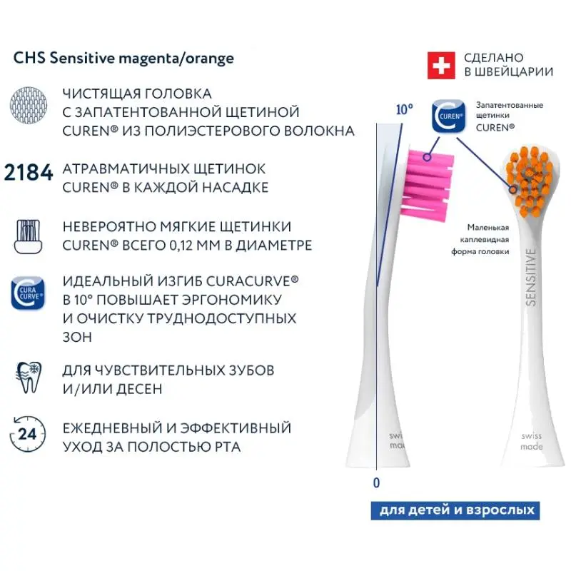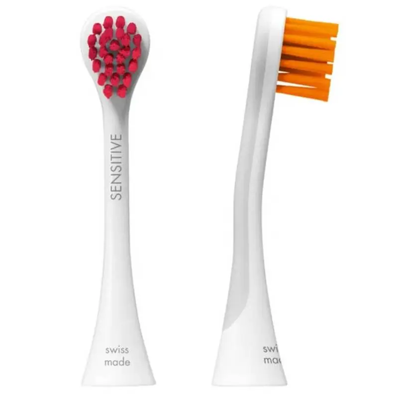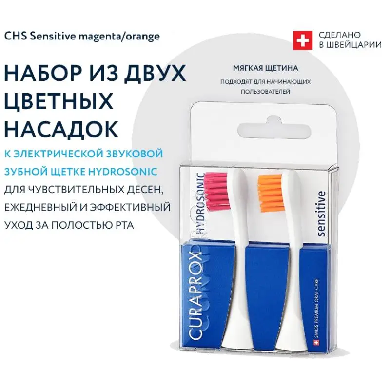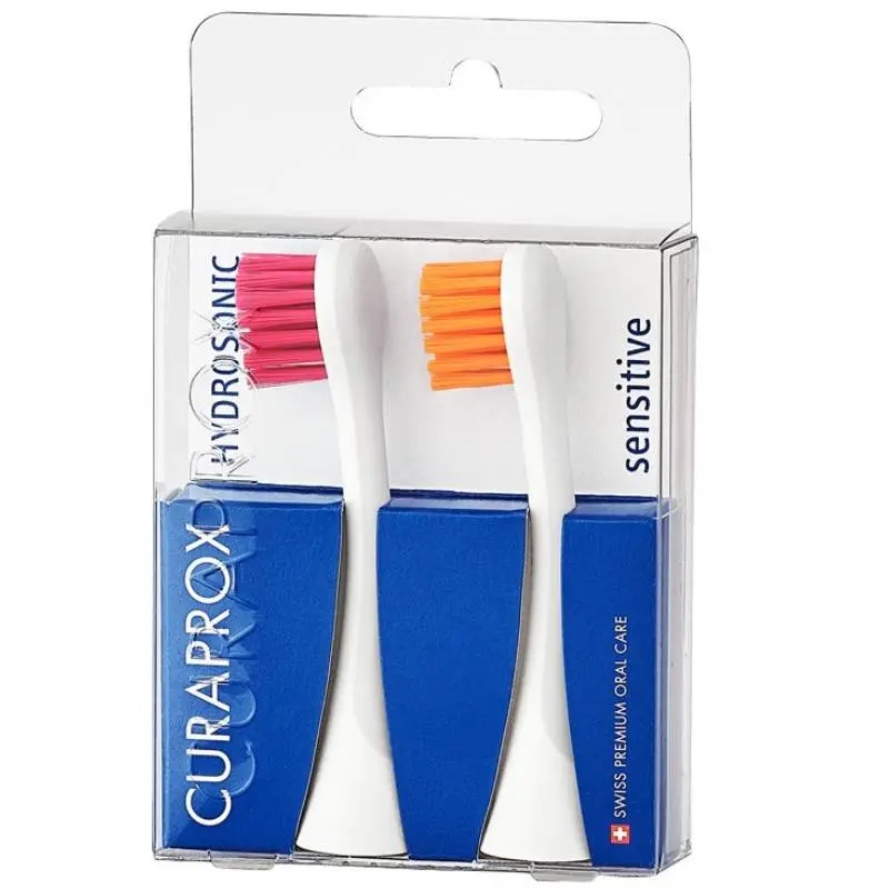 Набор из 2-х цветных сменных насадок для чувствительных десен Sensitive к звуковой щетке Curaprox Hydrosonic предназначен для режимов: