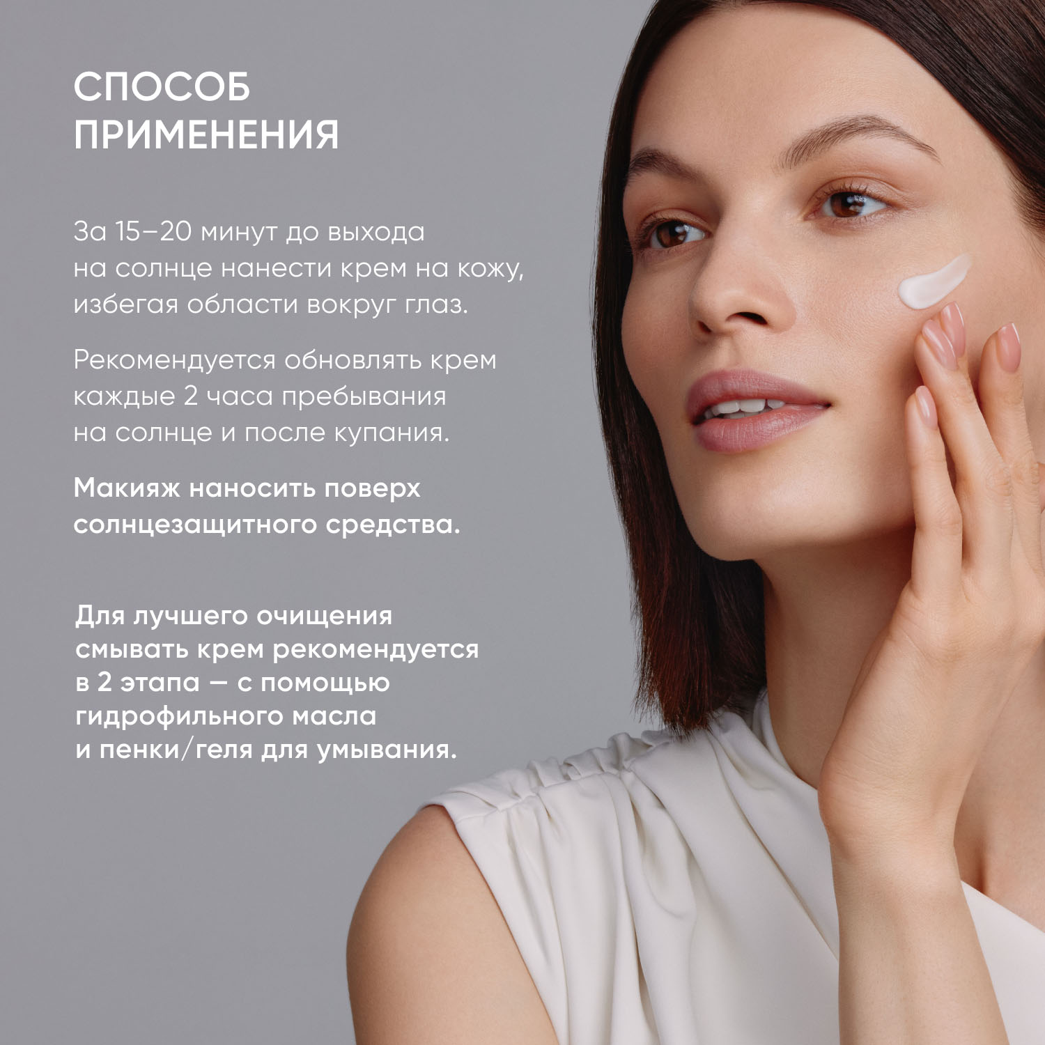 Нанести на кожу, избегая области вокруг глаз, дождаться полного впитывания. Применять за 15–20 минут до выхода на солнце. Обновлять каждые 2 часа и после купания.