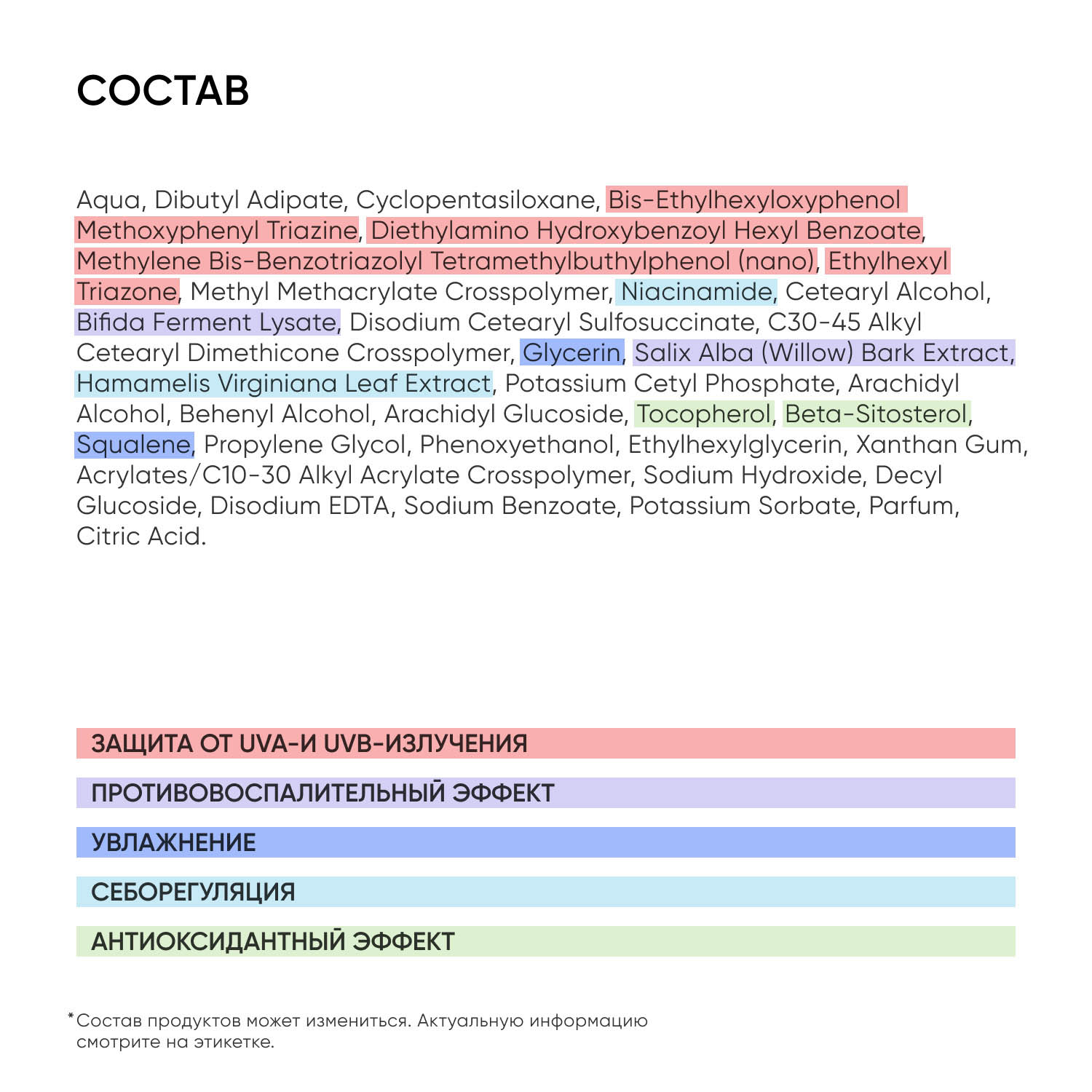 Состав: Aqua, Dibutyl Adipate, Cyclopentasiloxane, Bis-Ethylhexyloxyphenol Methoxyphenyl Triazine, Diethylamino Hydroxybenzoyl Hexyl Benzoate, Methylene Bis-Benzotriazolyl Tetramethylbuthylphenol (nano), Ethylhexyl Triazone, Methyl Methacrylate Crosspolymer, Niacinamide, Cetearyl Alcohol, Bifida Ferment Lysate, Disodium Cetearyl Sulfosuccinate, C30-45 Alkyl Cetearyl Dimethicone Crosspolymer, Glycerin, Salix Alba (Willow) Bark Extract, Hamamelis Virginiana (Witch Hazel) Leaf Extract, Potassium Cetyl Phosphate, Arachidyl Alcohol, Behenyl Alcohol, Arachidyl Glucoside, Tocopherol, Beta-Sitosterol, Squalene, Propylene Glycol, Phenoxyethanol, Ethylhexylglycerin, Xanthan Gum, Acrylates/C10-30 Alkyl Acrylate Crosspolymer, Sodium Hydroxide, Decyl Glucoside, Disodium EDTA, Sodium Benzoate, Potassium Sorbate, Parfum, Citric Acid.