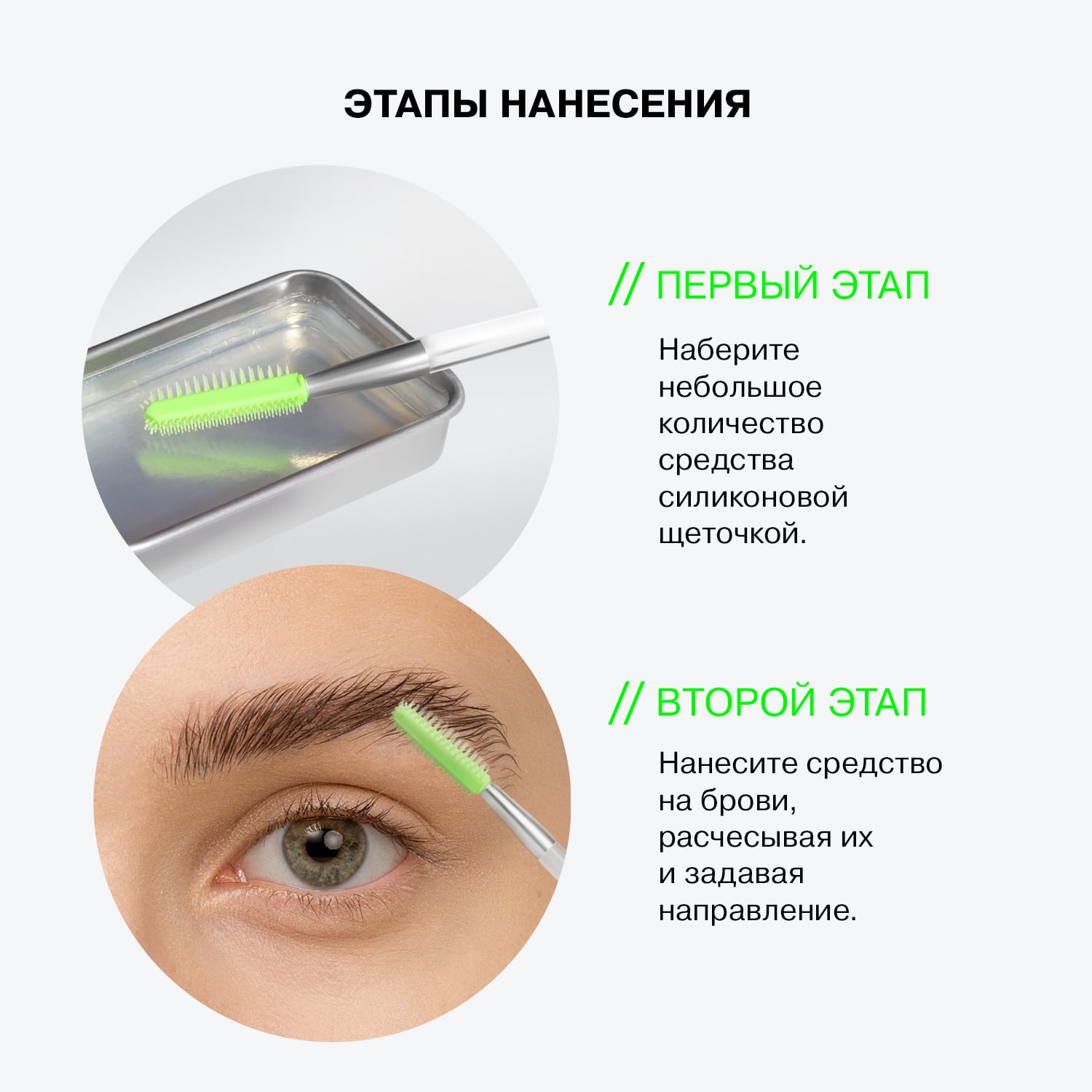 Перед использованием сбрызните водой средство Brow Robot. Нанесите средство с помощью силиконовой щеточки на брови, задавая направление и прижимая к коже.