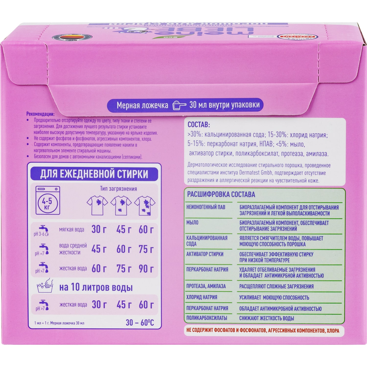 Состав: >30%: кальцинированная сода, 15-30%: хлорид натрия, 5-15%: перкарбонат натрия, НПАВ, <5%: мыло, активатор стирки, поликарбоксилат, протеаза, амилаза.