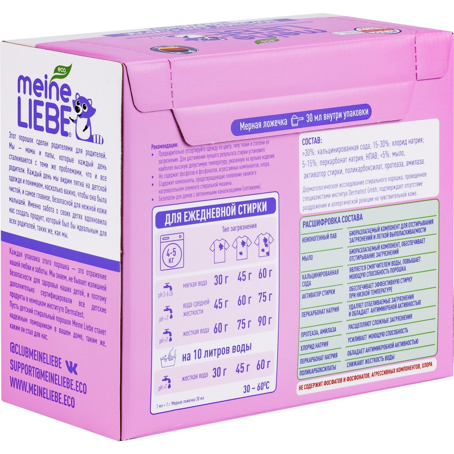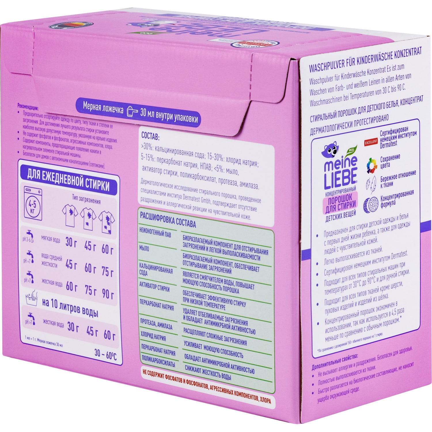 Предназначен для стирки детской одежды и белья с первых дней жизни ребенка, а также для одежды людей с чувствительной кожей. Подходит для всех типов стиральных машин при температурах от 30? до 90? и для ручной стирки. Не содержит энзимов и полностью выполаскивается из тканей