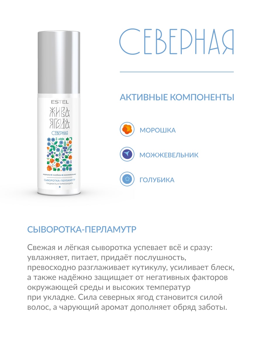 Свежая и лёгкая сыворотка успевает всё и сразу - увлажняет, питает, придаёт послушность, превосходно разглаживает кутикулу, усиливает блеск, а также надёжно защищает от негативных факторов окружающей среды и высоких температур при укладке. Сила северных ягод становится силой волос, а чарующий аромат дополняет обряд заботы.