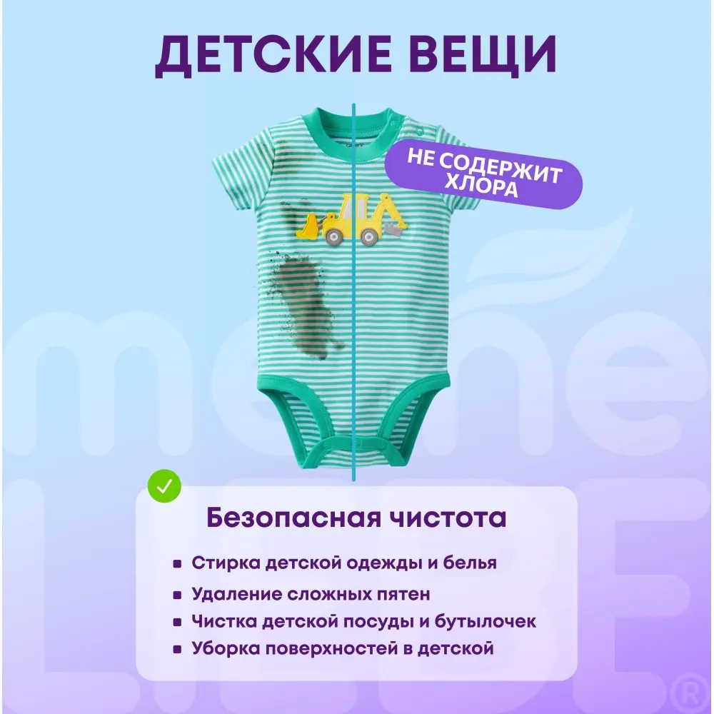 Отстирывает одежду и текстиль: для цветного, белого и детского белья работает как усилитель для стирки, удаляет сложные пятна с одежды (пятна грязи, крови, травы, жира, вина, пищевых продуктов, косметики, органических загрязнений), устраняет запахи, отбеливает, очищает обувь (текстильные кроссовки), защищает от налета и накипи стиральную машинку. Подходит для стиральных машин и ручной стирки.