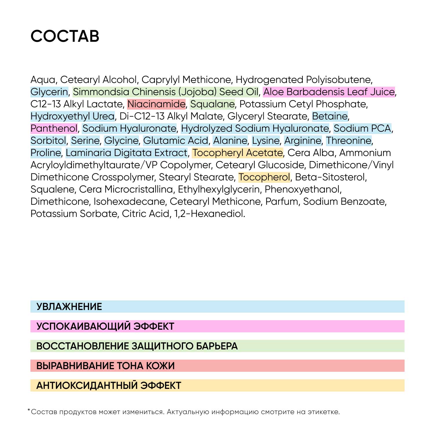 Состав: aqua, cetearyl alcohol, caprylyl methicone, hydrogenated polyisobutene, glycerin, simmondsia chinensis (jojoba) seed oil, aloe barbadensis leaf juice, c12-13 alkyl lactate, niacinamide, squalane, potassium cetyl phosphate, hydroxyethyl urea, di-c12-13 alkyl malate, glyceryl stearate, betaine, panthenol, sodium hyaluronate, hydrolyzed sodium hyaluronate, sodium pca, sorbitol, serine, glycine, glutamic acid, alanine, lysine, arginine, threonine, proline, laminaria digitata extract, tocopheryl acetate, cera alba, ammonium acryloyldimethyltaurate/vp copolymer, cetearyl glucoside, dimethicone/vinyl dimethicone crosspolymer, stearyl stearate, tocopherol, beta-sitosterol, squalene, cera microcristallina, ethylhexylglycerin, phenoxyethanol, dimethicone, isohexadecane, cetearyl methicone, parfum, sodium benzoate, potassium sorbate, citric acid, 1,2-hexanediol.