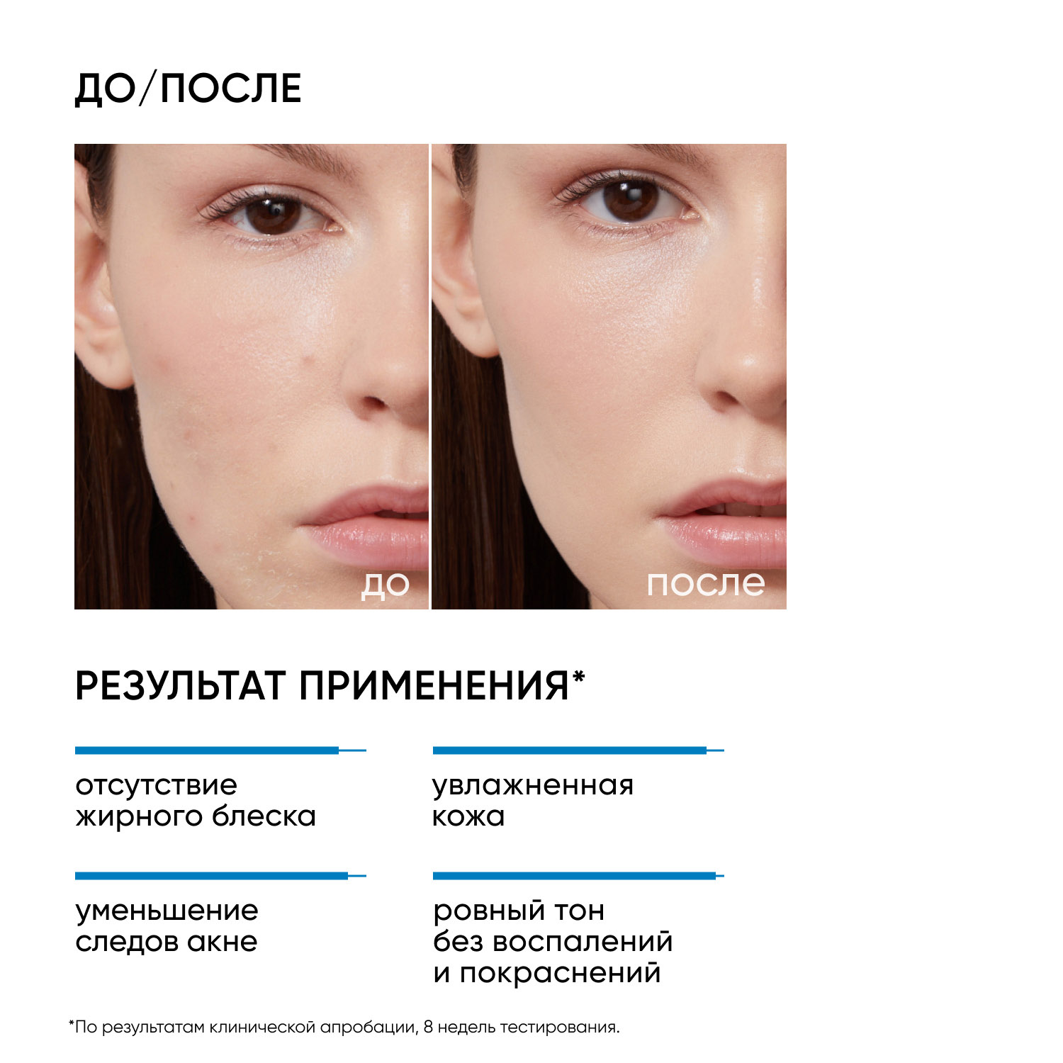 Результат применения: кожа увлажнена и выглядит более гладкой и здоровой, несовершенства и жирный блеск менее выражены.