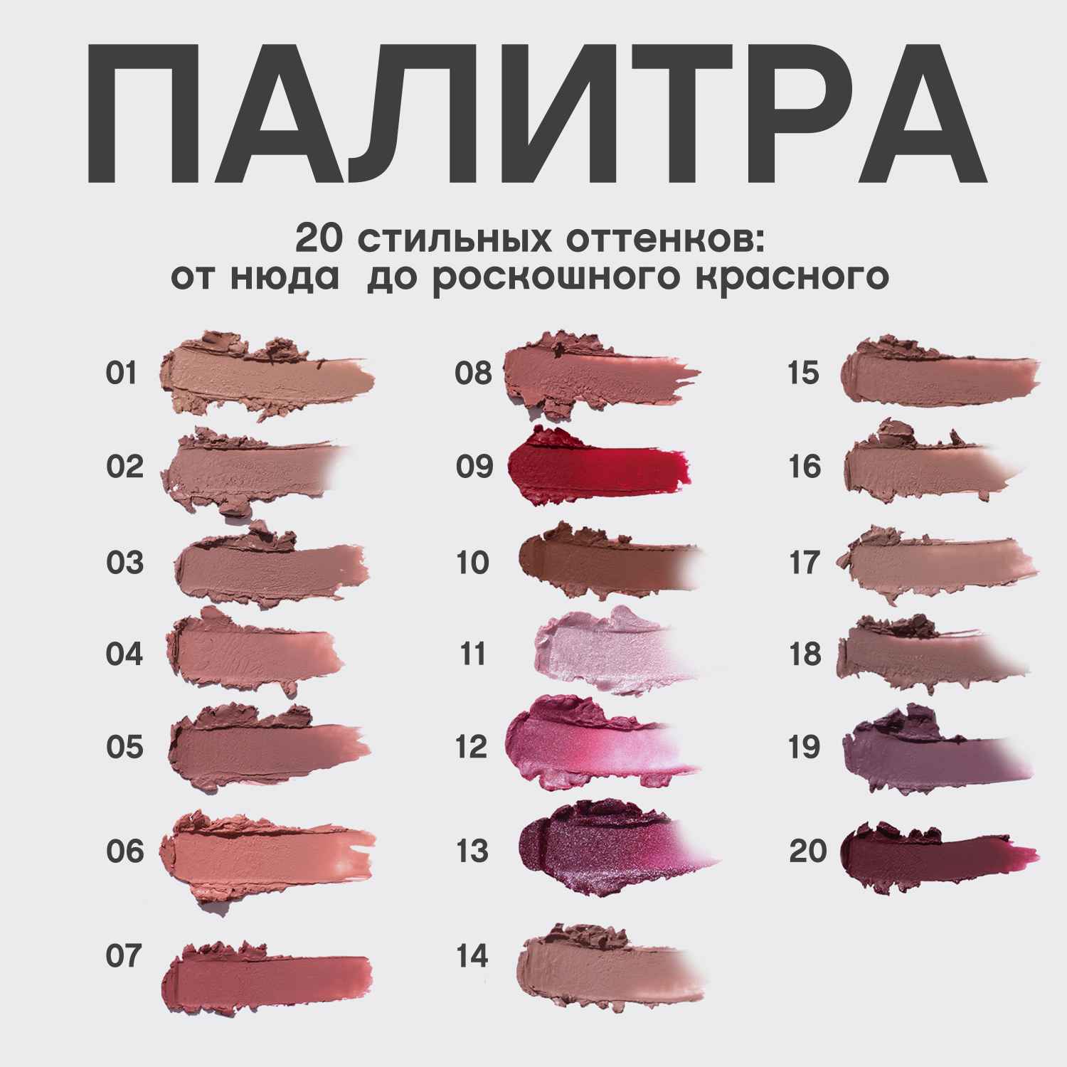 Двадцать восхитительных оттенков - от модных нюдовых до классического красного - стойко держатся на губах и подходят абсолютно всем.