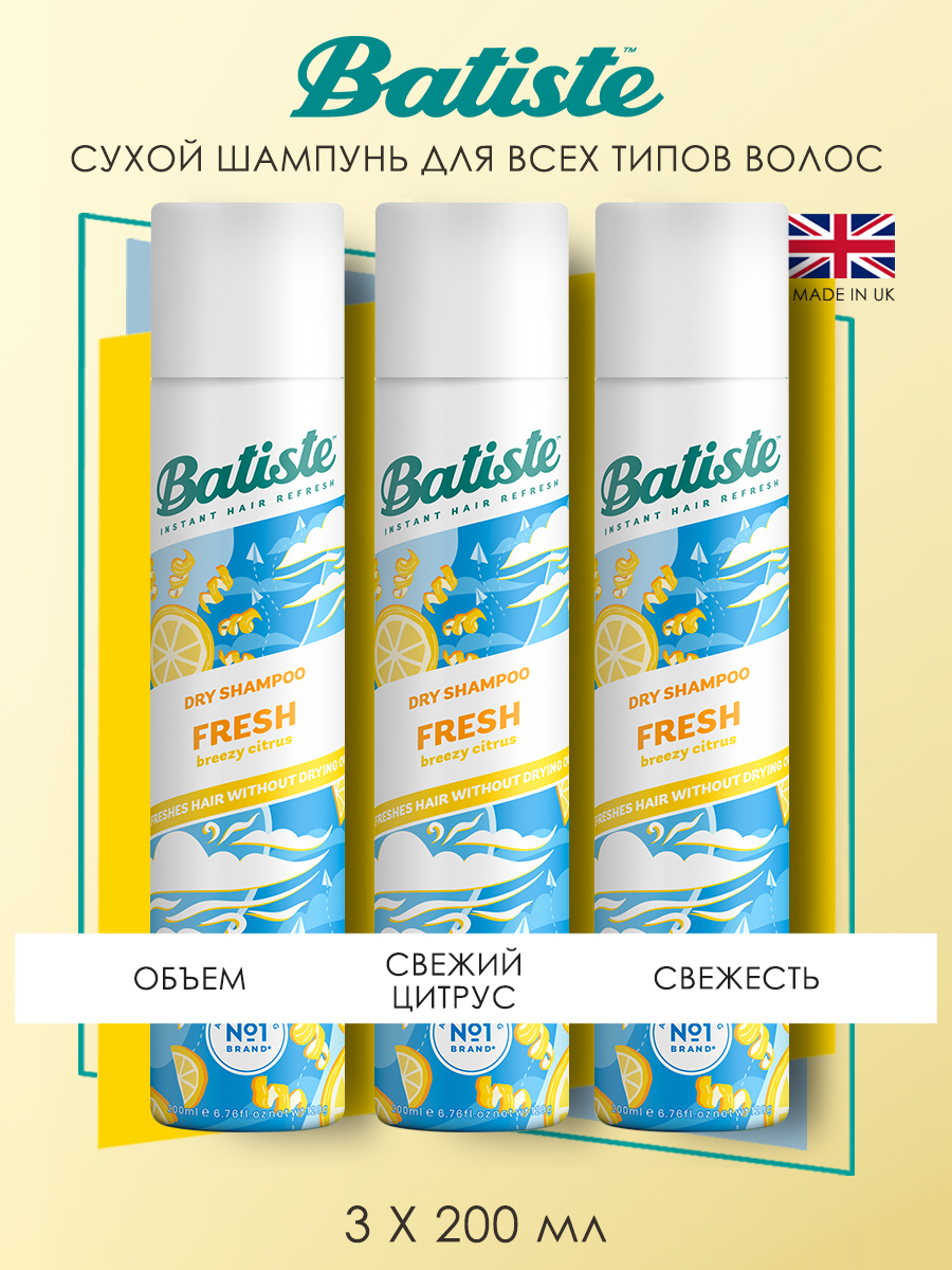 В набор входят три флакона сухого шампуня для волос Fresh с ароматом свежести, 200 мл