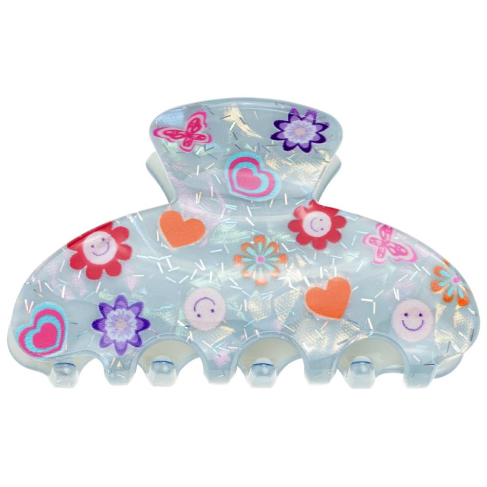 Первая абсолютно прозрачная заколка украшена россыпью «космических» конфетти. Дизайн второй вдохновлен соцсетями, где каждый может почувствовать себя знаменитостью: нежно-голубой крабик украшен различными эмодзи в виде смайлов, цветов и сердечек.