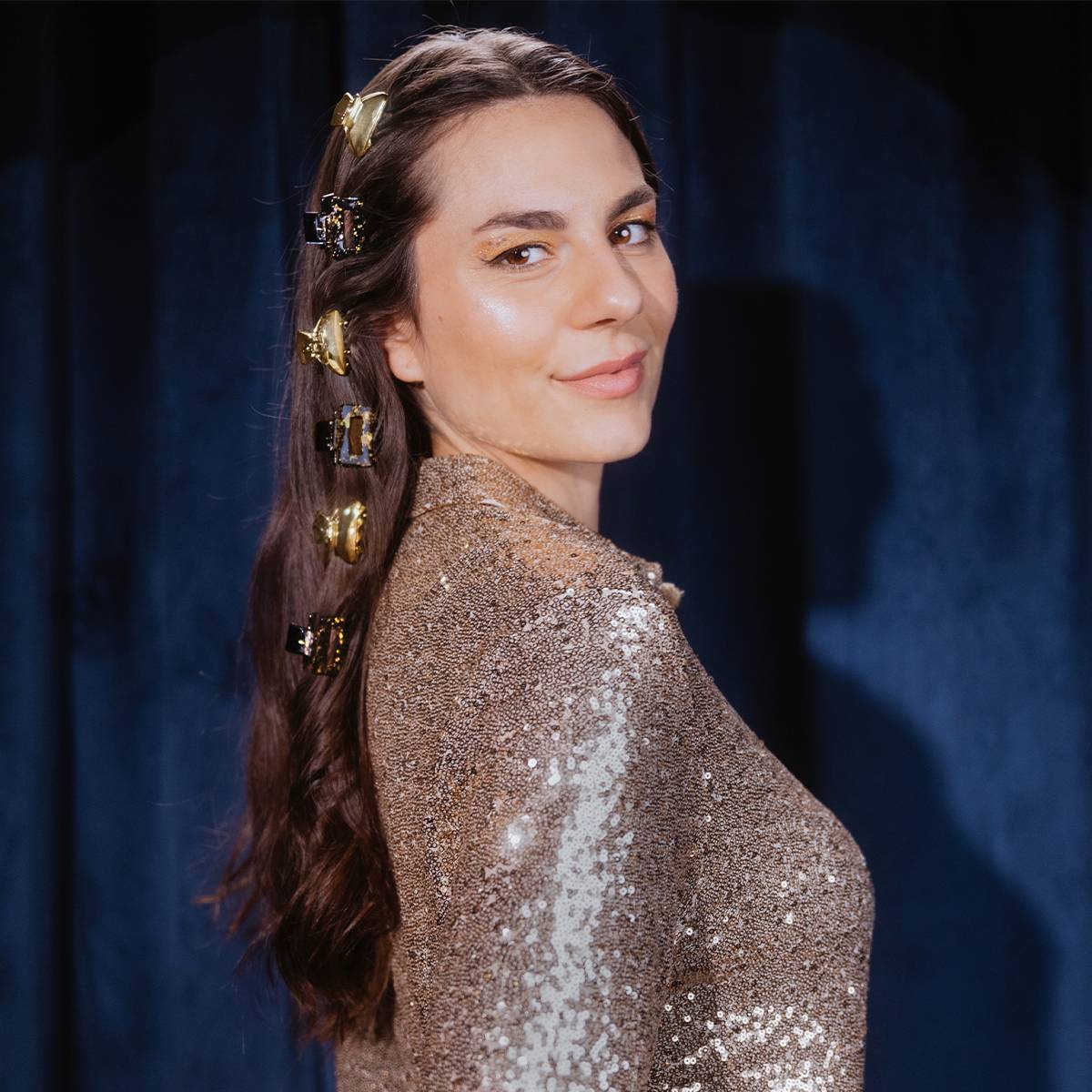 Invisibobble Clipstar Eclipse Lunar Glam — это набор заколок для волос, дизайн которых вдохновлен контрастами звездного неба во время солнечного затмения. Внутри — два мини-крабика с разным характером. Один — черный с сияющими золотыми вкраплениями: как ночное небо, усыпанное звездами. Второй — гладкий золотой, словно капля солнечного света. Оба идеально подходят для создания гармоничного образа с вашими золотыми украшениями: серьгами, кольцами и кулонами. Clipstar надежно при этом бережно фиксирует небольшие пряди волос, мгновенно добавляя очарование любой прическе. Комбинируйте заколочки в образах, чтобы подчеркнуть свою индивидуальность. Для любых образов, для всех типов волос.