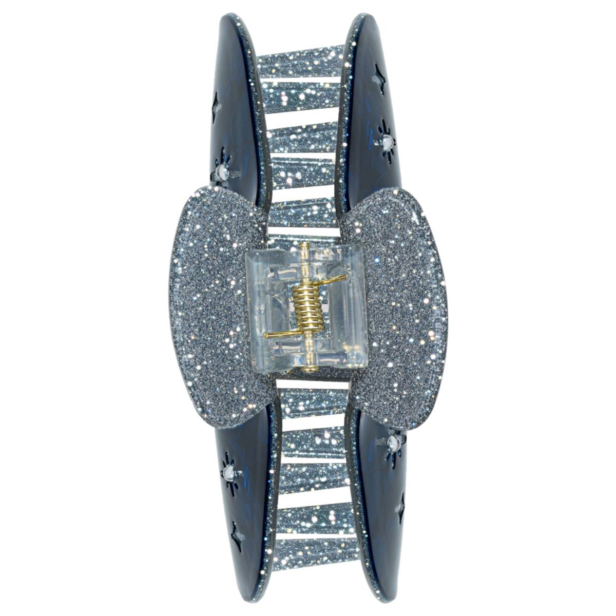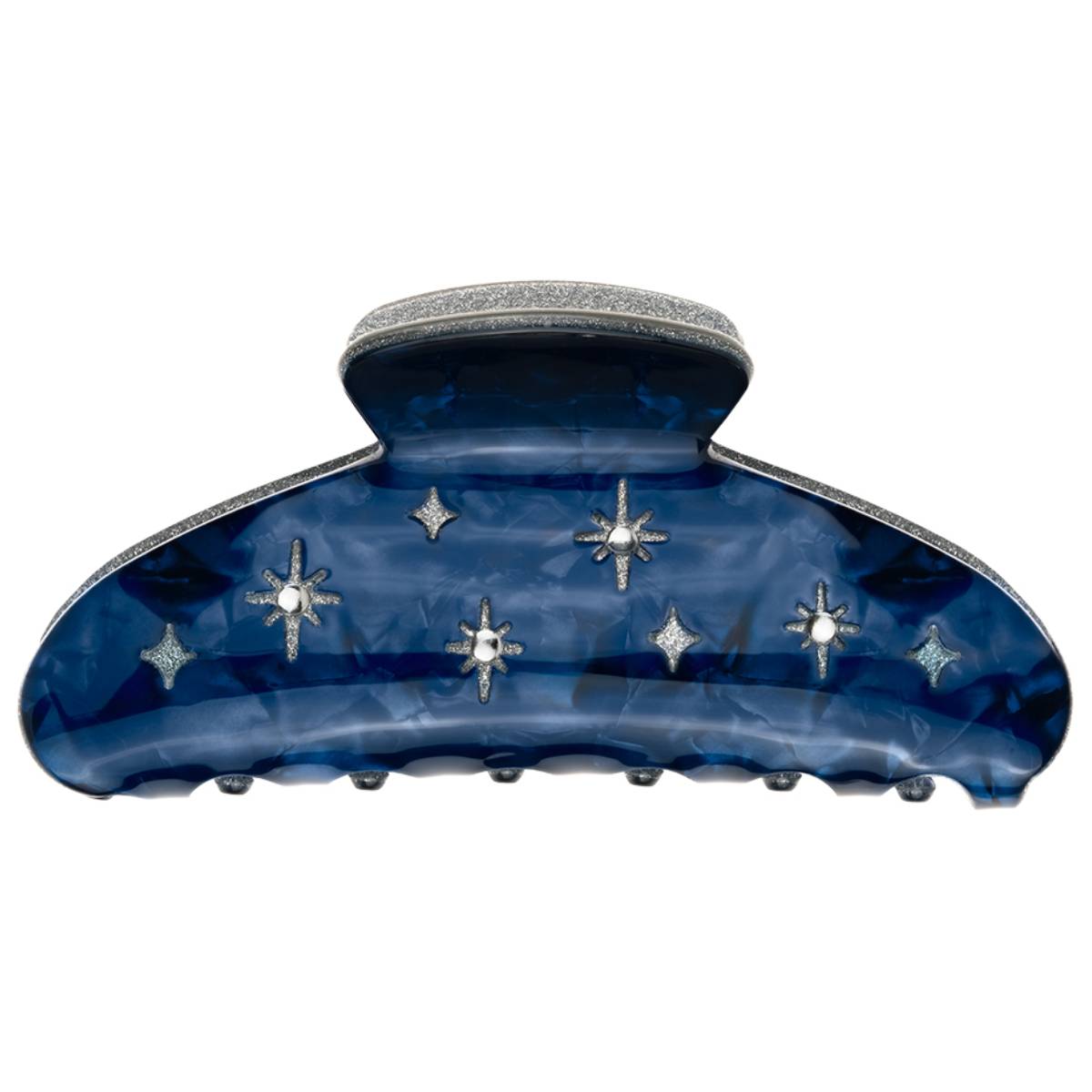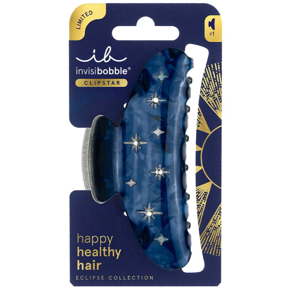 Invisibobble Clipstar Eclipse Nightfall — стильная заколка-крабик для волос, дизайн которой имитирует звездное небо. Глубокий синий оттенок с переливами удачно дополняет россыпь из серебристых звезд. Внутренняя часть заколки также украшена серебряным глиттером, создающим ослепительное мерцание.